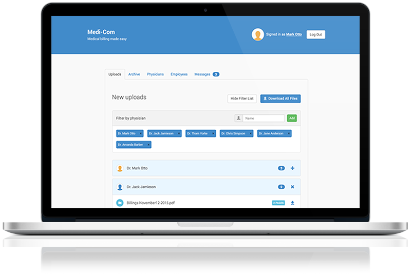 Physicians are required to document and submit charges to the government for the serivces they provide throughout each of their shifts. Typically physicans hire third parties to handle the documentation submission and payment logistics. Medicom is one such provider of these services. Most companies in this industry rely on fax machines and mail to handle the transactions for security reasons. Medicom hired us to build a web application that would ease the submission and tracking of these charges using the power of the cloud.